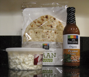 - Spread the peanut sauce thinly over a piece of naan.